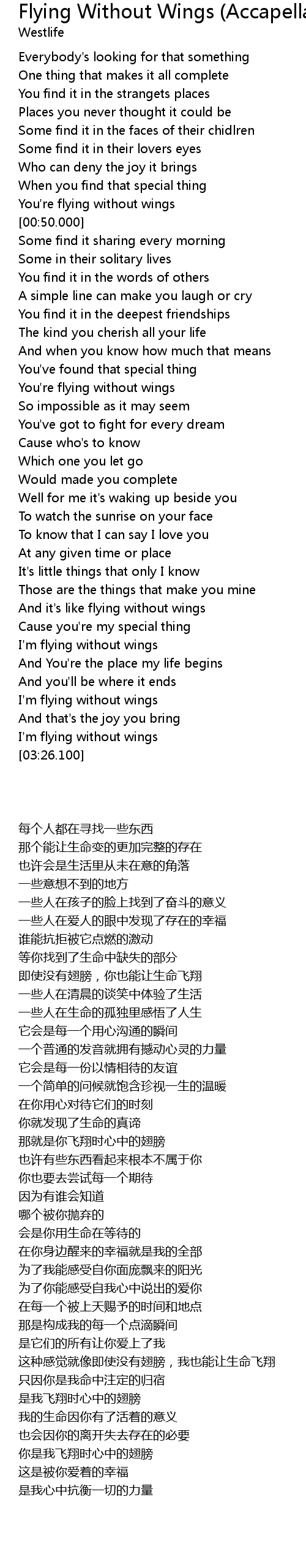 ----------------------Disclaimer----------------------- I DO NOT own this song, it belongs to it's rightful owner. This song is only meant for entertainment. Lyrics: Shane: Everybody's looking for that something One thing that makes it all complete You'll find it in the strangest places Places you never knew it could be Some find it in the face of their children Some find it in their lover's eyes Who can deny the joy it brings When you've found that special thing You're flying without wings Mark: Some find it sharing every morning Some in their solitary lives You'll find it in the words of others A simple line can make you laugh or cry You'll find it in the deepest friendship The kind you cherish all your life And when you know how much that means You've found that special thing You're flying without wings So, impossible as it may seem You've got to fight for every dream 'Cause who's to know which one you let go Would have made you complete Shane: Well, for me it's waking up beside you To watch the sunrise on your face To know that I can say I love you At any given time or place Mark: It's little things that only I know Those are the things that make you mine And it's like flying without wings 'Cause you're my special thing I'm flying without wings Shane: And you're the place my life begins And you'll be where it ends Mark: I'm flying without wings And that's the joy you bring I'm flying without wings